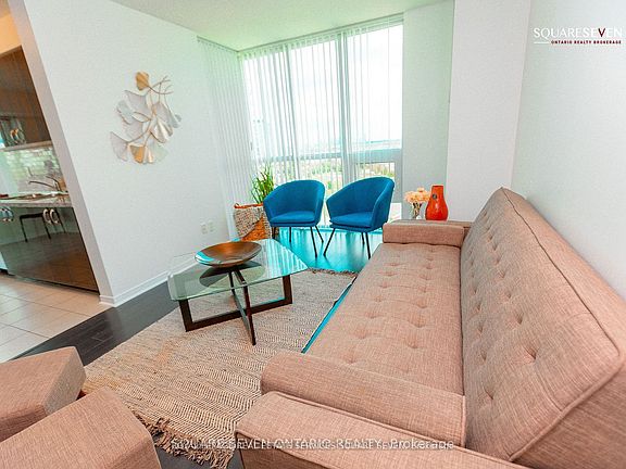 Beautiful corner unit offering 2 beds, 2 3Pc baths, tastefully designed W/ O/C Living, wide plank flooring. Kitchen features quartz counters, white tiled backsplash & S/S appliances. Walk/out to private balcony with 180 degrees of city view, complete with in-suite laundry. One parking & one locker. Amenities included indoor pool, gym, 24Hr concierge, security guard, rooftop, part room. Close to major amenities.