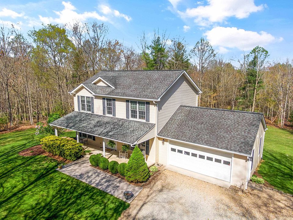 This 3 Bed, 2 1/2 Bath home sits on over nine acres of land, offering privacy and convenience. As you enter, there is an office space to your left and dining to the right. Walk past the stairs to the open-style kitchen/living room, and the sunroom will invite you to unwind in the natural light of its large windows. The focal point of this space is a cozy wood stove, promising comfort during chilly evenings. Step out on the deck for your morning coffee or entertain friends. The primary bedroom offers a walk-in closet and a private bath. The other two bedrooms and a full bathroom for family or guests are opposite the hall. Outside, the expansive nine-acre property offers endless possibilities, whether for a garden, outdoor adventures, or simply enjoying the beauty of nature, with a full unfinished walk-out basement with room for storage or a recreation area.
