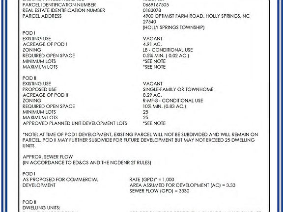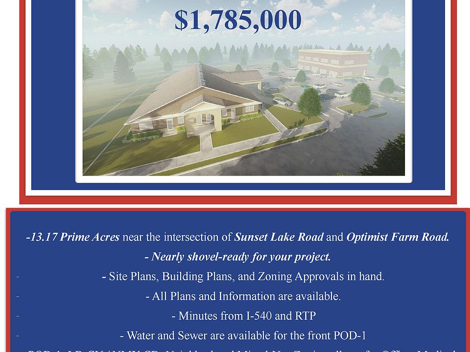 Excellent Development Opportunity in Holly Springs! This 13.17± acre business site offers prime positioning with easy access to I-540, Holly Springs, and Fuquay-Varina. Ideally located near Sunset Lake Commons Retail Center and surrounding amenities, the property features approximately 385 feet of frontage on Optimist Farm Road with additional access from South Bell Haven Street on the north side. 4900 Optimist Farm Road is zoned LB-CU / NMX CD on the front portion and R-MF-8 / NCR CD in the rear. The site is nearly shovel-ready with approved site plans, building plans, and zoning approvals in hand. Water and sewer are available to the front POD (POD-1). POD-1 (LB-CU / NMX CD): Neighborhood Mixed-Use Zoning - allows for Office, Medical, Veterinary, Group Home, Residential Care Facilities, and more. POD-2 (R-MF-8 / NCR CD): Neighborhood Center Residential Conditional District - allows for single-family or townhome units. This property offers a unique mixed-use development opportunity, blending commercial and residential components in a high-growth corridor near major transportation routes and employment hubs like RTP. Showings by appointment only with 24 hours' notice.
