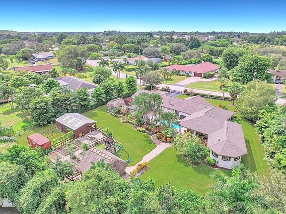 YOUR VERY OWN SOUTHWEST RANCHES PRIVATE RETREAT AWAITS! GORGEOUS HOME FEATURING CHEF'S KITCHEN W ISLAND, STAINLESS APPLIANCES, VIKING FRIDGE, BOSCH COOKTOP, OVEN & WARMING DRAWER, MIELE COFFEE MAKER, WOOD CABINETS IN KITCHEN & BEAUTIFUL WET BAR; HIGH CEILINGS W ELEGANT BEAMS, ROMANTIC WOOD BURNING FIREPLACE, MARBLE FLOORS. GRAND PRIMARY SUITE W 2 CLOSETS, SPA-LIKE BATH W 2 VANITIES, JETTED TUB & WALK-IN SHOWER. SOLID DOORS INSIDE, IMPACT WINDOWS & GARAGE DOORS. PERFECT HOME TO ENTERTAIN, THERE IS SOMETHING FUN FOR ALL AGES. OUTDOOR FULLY EQUIPPED KITCHEN W ICEMAKER, FREEZER, STAINLESS BBQ & DRAWERS, REFRESHING POOL, PLAYGROUND, 2 CHICKEE HUTS W PAVER FLOORS, SEVERAL VARIETIES OF FRUIT TREES, VEGETABLE GARDEN & CHICKEN COOP. PARK 10+ CARS BETWEEN GARAGE & DRIVEWAYS + ROOM FOR RV PARKING.