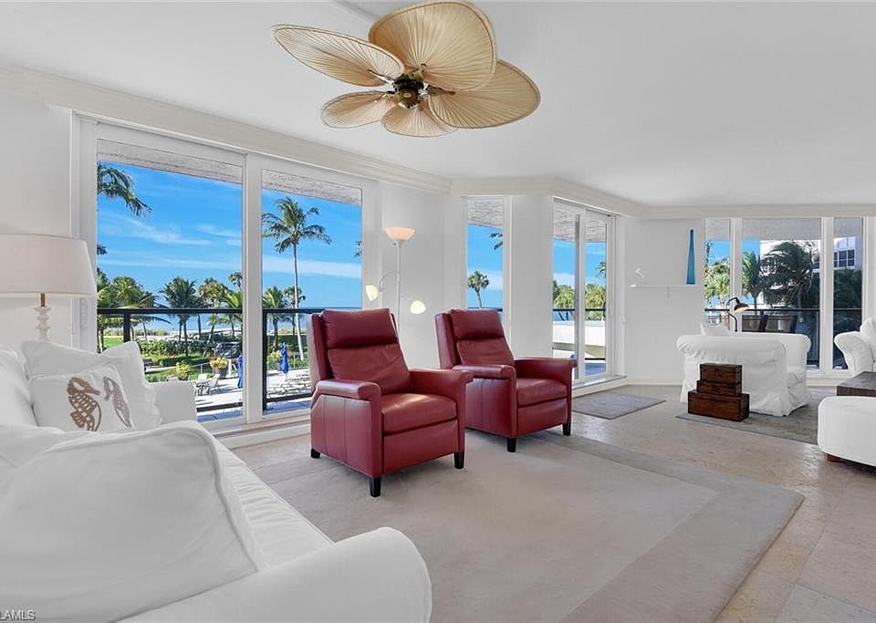 Experience the beauty of beachfront living in this exceptional residence overlooking Naples' most prestigious stretch of white-sand beach. Designed for relaxed coastal living, this inviting retreat is defined by its expansive wraparound balcony, where panoramic Gulf views, gentle sea breezes, and unforgettable sunsets become part of your everyday experience. The residence features two well-appointed bedrooms plus a Gulf-view den, offering a spacious and welcoming layout ideal for families or guests seeking a serene seaside escape. The true highlight of the home is the wraparound Gulf-front balcony, accessible from the main living areas and perfectly positioned to capture sweeping views of the turquoise water, palm-lined grounds, and pristine shoreline. Whether enjoying morning coffee, dining al fresco, or watching the sun dip into the horizon, this outdoor space creates a seamless connection to the beach and ocean beyond. The primary bedroom serves as a peaceful retreat, featuring a comfortable king bed, soothing coastal decor, and a private ensuite bath with a walk-in shower. Wake up to natural light and the calming presence of the Gulf just beyond. The second bedroom suite is thoughtfully designed for versatility, offering a cozy queen bed along with an attached bonus room featuring twin bunk beds, ideal for children or additional guests. The ensuite bath includes a walk-in shower and a relaxing soaking tub, perfect after a sun-filled day. The Gulf-view den provides an additional space to unwind ideal for reading, quiet moments, or simply taking in the ever-changing ocean scenery. Perfectly located for both relaxation and exploration, this beachfront retreat places you just steps from the sand while keeping Naples' renowned dining, shopping, and local attractions close at hand. With its remarkable balcony views and unbeatable location, this home offers a truly memorable coastal getaway.