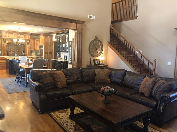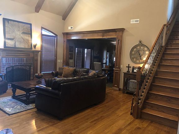 Heavy trim and hardwood flooring on main floor, easy flow floor plan, Master and 2nd BEd/Office on main floor, Theatre room, covered back porch and fire pit