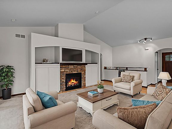 Center islandStunning interior designCozy fireplacePrivate luxury bathLandscaped greenspaceVaulted ceilingsOpen floor plan