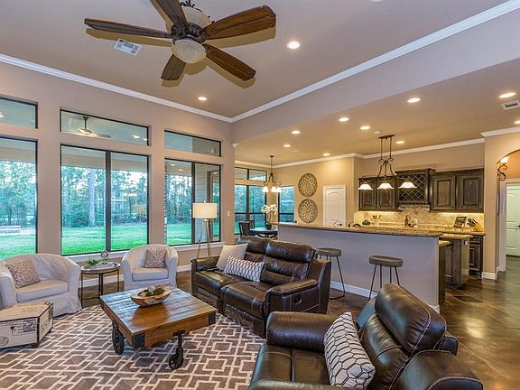 HARD TO FIND 1 STORY in Benders Landing Estates! Close to The Woodlands! Enjoy this 4 bed/3bath/3 full car garage w/ bump out workspace (not tandem). Stunning, yet comfortable, describes this classy country-style home! Inviting custom fire pit patio + huge covered patio w/ TV mount! Back is bordered w/ mature trees-no neighbors behind! Gorgeous custom features w/ high ceilings, crown moulding, beautiful windows! Custom stained concrete flooring in main areas. Centerpiece of home: HUGE ISLAND KITCHEN w/ breakfast bar, 6 burner stove, custom distressed cabinetry, stainless appliances, extra large pantry + open to living & breakfast! Elegant formal dining! Nice private study/home office w/ wood doors. Sumptuous master suite: private access to back yard patio, master bath w/ jetted corner tub, 2 separate vanities + well appointed & spacious master closet! 3 more ample bedrooms. Spacious laundry with tons of extra storage. This is the one!