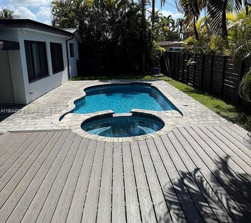 Beautifully remodeled single-family home on a corner lot, with plenty of parking spaces, 3 bedrooms, 3 bathrooms, an extra room for an office, a spacious family room with a built-in bar, laundry room, partially furnished, impact windows, a great patio for entertainment with a covered terrace, pool, and a jacuzzi. The owner will pay for pool and lawn maintenance.