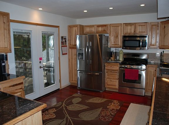 Spacious 4 bedroom home loaded with update! Featuring hardwood floors throughout main level, completely remodeled kitchen (Stainless Steel appliances, Hickory Cabinets, Granite Counters, Brazilian Cherry Floors) & baths, open living room with gas fireplace, dining room with vaulted ceiling, Walk-out lower level boasts a Mother-in-law suite with bedroom, bath, kitchen & living area! TONS of Storage, 4 plus car garage & New Roof (April 15, 2015)!