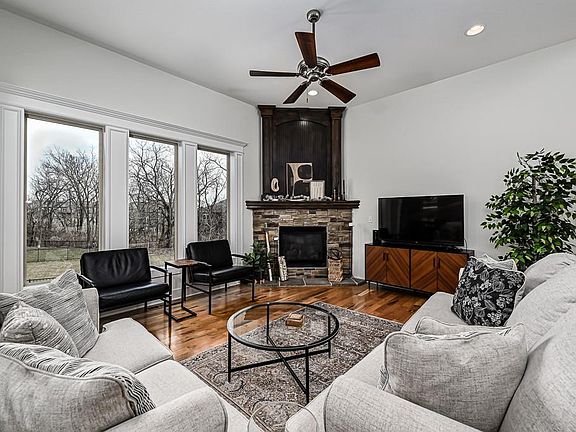 AWARD WINNING 4 BEDROOM REVERSE 1.5 STORY ARISTA PLAN! This is a previous model home loaded with extras in coveted Falcon Lakes! Home features an open floor plan with Primary bedroom & Second bedroom on main level, Great Room with fireplace open to Kitchen w/Custom cabinets, granite counters, SS appliances, breakfast bar, walk-in pantry, & Laundry room around the corner, leading to 3 car garage. 12K of upgraded flooring throughout interior including hardwood and LVP and 15K of new paint and stain throughout interior and exterior! Covered porch overlooking beautiful lot w/greens just beyond the trees. Walkout basement is finished with 2 more bedrooms, family room, media room with wet bar, and full bath!