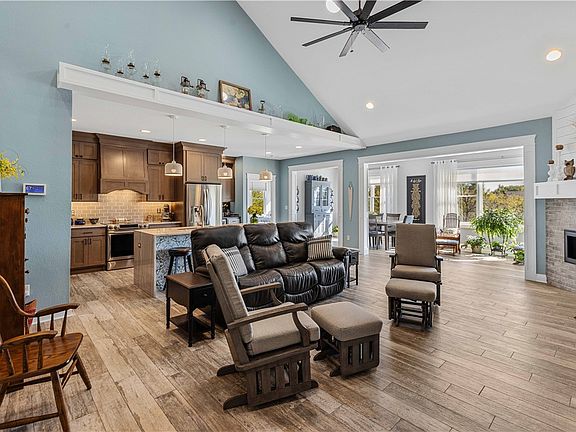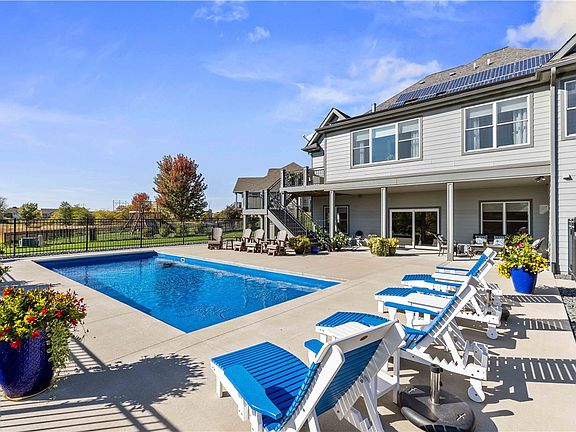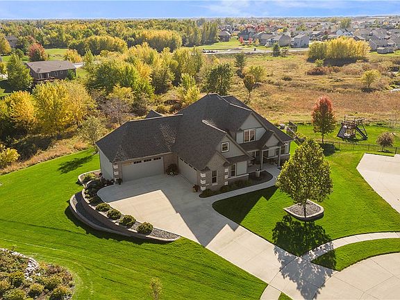 Stunning views and great privacy for this 1.5-sty home in a cul-de-sac location. Premium .559 acre lot in the St. James Place neighborhood. An inviting zero-entry leads to an impressive great room with a vaulted ceiling, brick and shiplap-faced fireplace, and built-ins. The kitchen is sure to delight with quartzite counters with a waterfall edge, beautiful cabinets that extend to the ceiling, under cabinet lighting, a beverage station with a mini-refrigerator, and a center island snack bar. An addition was added in 2018 which offers a large dining area and sitting area and leads to a composite deck and stairs to a large patio. The primary ensuite boasts panoramic views, a raised ceiling, two walk-in closets, linen closet, double sinks, free-standing Kohler bubble tub, tiled shower, and a heated floor. A dining room, mudroom with built-ins, laundry room, two additional bedrooms, and full bathroom complete the main level. An open staircase leads to a 2nd level with two large bedrooms and a full bathroom. The walk-out lower level was finished in 2022 and includes a large family room, exercise room, 6th bedroom, a luxurious 3/4 bathroom, and large storage room. The rear yard is perfect for friends and family to enjoy swimming in the heated pool and lounging around the pool and patio. The four-car garage has an epoxy-coated floor. Irrigation system. Solar panels provide utility cost savings. Quality Ankeny schools.
