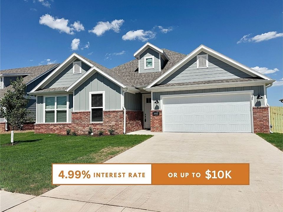 Fence, blinds and gutters included! Discover your dream home in the sought-after Osage Hills neighborhood. Clinton plan with garage on the right & West facing! 9 ft ceilings, linear electric fireplace in the living room, LVP flooring throughout the main living areas and primary bedroom, quartz countertops and more. Chef's kitchen boasting frigidaire stainless steel appliances, gas range, pantry, quartz countertops, bar pull handles, large island and gorgeous backsplash. Luxurious primary bedroom features abundant natural light, while the spa-like primary bathroom offers a walk-in shower, double sinks and spacious walk-in closets. Two secondary bedrooms on the main level, a 4th bedroom upstairs that would be a perfect bonus room & a separate laundry room. Nestled on a generous lot with covered patio that overlooks the serene sodded, fully fenced backyard. Sturdy concrete siding & brick! Model home located at 6008 SW Coywolf St- Lot 122.