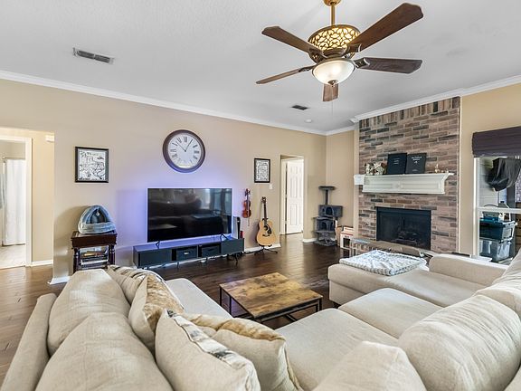 Welcome home, step into this beautifully maintained one-story home featuring hard surface flooring throughout, with rich wood floors that seamlessly flow from the entry into the living room, hallway, and office. The spacious living area is highlighted by elegant crown molding, a cozy fireplace, and serene views of the sparkling backyard pool. Designed with an open-concept layout, the home boasts a generous kitchen equipped with granite countertops, a center island, mosaic tile backsplash, stainless steel appliances, a breakfast bar, and ample cabinet and counter space. Adjacent to the kitchen, the dining area offers bay windows that frame a perfect view of the pool that is ideal for relaxed meals or entertaining.