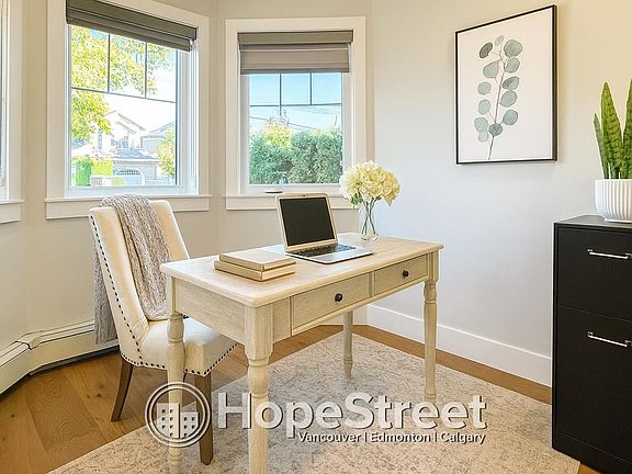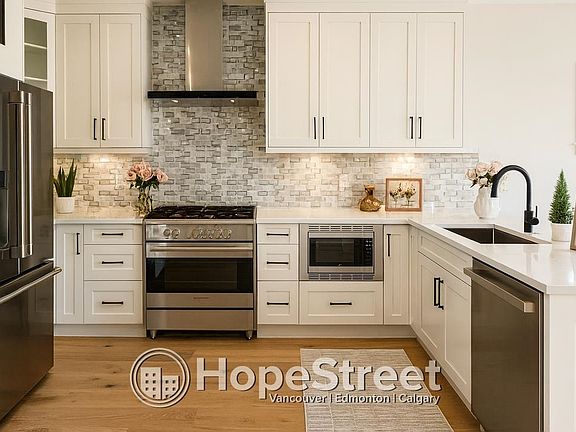 This 2,800 sq. ft. three-story home blends modern design with premium finishes. The exterior boasts dark blue siding with light trim, bay windows, and a double garage. Inside, wide-plank hardwood floors, neutral tones, and recessed lighting enhance the open layout. The gourmet kitchen features white shaker cabinets, quartz counters, mosaic backsplash, and high-end stainless appliances. Three bedrooms are on the second floor, with a private loft-style suite and ensuite above. Bathrooms showcase quartz vanities, frameless showers, and sleek black fixtures. A main-floor office offers flex space. Amenities include central vac, hydronic heating, dual-shade blinds, and water included. Walk to Ladner Village, shops, parks, schools, and enjoy easy access to Highway 17A, transit, and BC Ferries.