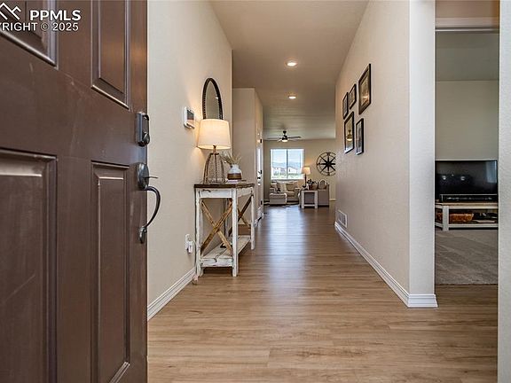 Better than new - this stylish, tasteful ranch plan in Bradley Heights is a turn-key home less than 1 yr old and ready for you to move right in. Enjoy watching the sunset over Pikes Peak every day with an expansive view of the mountains while appreciating the privacy of having a greenbelt open space behind your home. Function and beauty partner in this open floor plan featuring contemporary, low-maintenance building materials for your busy life such as luxury vinyl flooring, quartz countertops, recessed can lighting, durable cement-board siding, vinyl fencing and more. Bedrooms are generous in size and there is a crawl space for added storage. SMART Features include a thermostat programable with your phone, and a whole-house system for lights, locks and security is available too. Revel in the gourmet kitchen with gas range, expansive Island, all stainless steel appliances and a large, corner pantry. This is a fantastic space for entertaining. The abundance of natural light blended with the fresh, earthy tones of the decor are timeless and will allow you to easily introduce your own style. Landscaping and Window Coverings are already installed. And don't miss the finished Garage with insulation, drywall and premier epoxy flooring for easy cleaning. A large patio in the backyard will be great for BBQs or just reading a great book! Easy quick commute to Peterson AFB, Schriever, Space Force and Ft. Carson. The overall community offers beautiful scenery and quick access to an abundance of recreational activities like hiking trails, native wildlife viewing, the Big Johnson Reservoir and Bluestem Prairie Open Space—boasting hundreds of acres of prairie land. Bradley Heights is also a short distance from prime shopping, dining and retail options. Set up your showing today. You'll be happy you did.