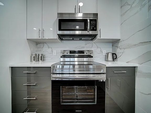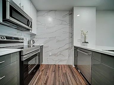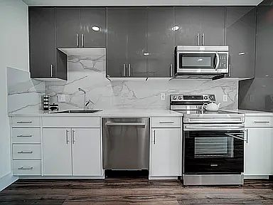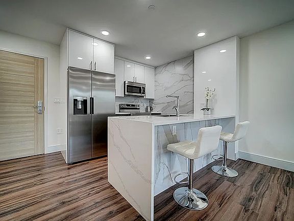 Prepare to host in this beautifully designed home where every corner is a statement of style! At the heart of it all is the chef's grade kitchen, a true centerpiece featuring dramatic two tone cabinetry, expansive waterfall quartz countertops, and top tier stainless steel appliances, perfect for any gathering. The open concept layout flows effortlessly over rich wood style floors, bathed in natural light, while the luxurious bathroom acts as your private, spa like getaway, fully wrapped in chic, marble style tile. This is your chance to own a fully updated, turnkey property that promises sophisticated living and effortless entertaining.