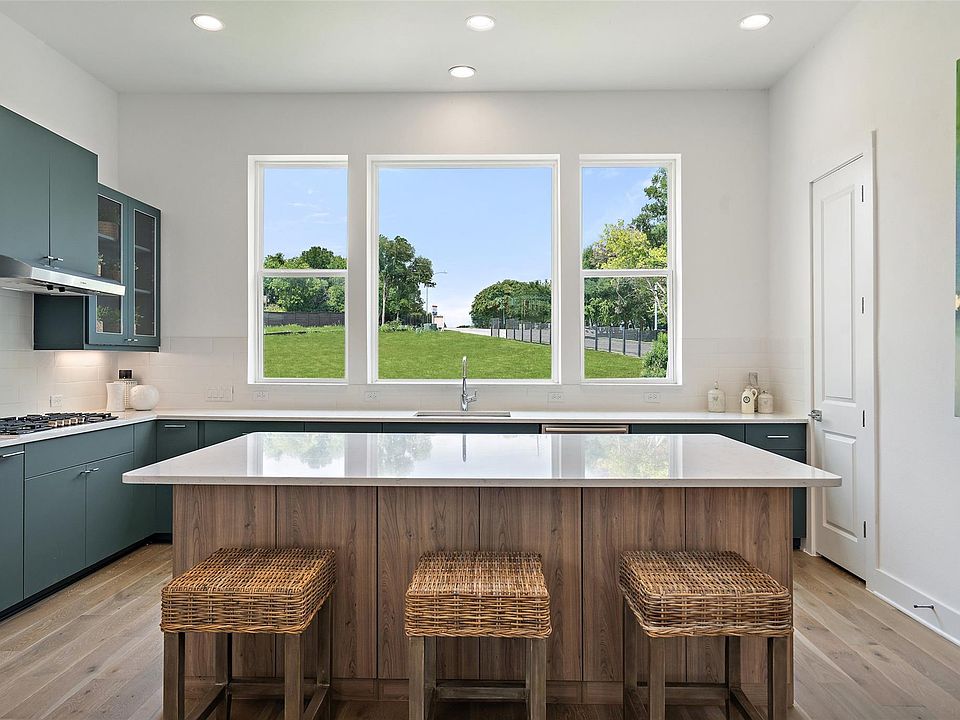 Soft close contemporary cabinetsCorner unitHardwood floorsBosch appliancesLots of windowsQuartz countertopsLarge soaking tub