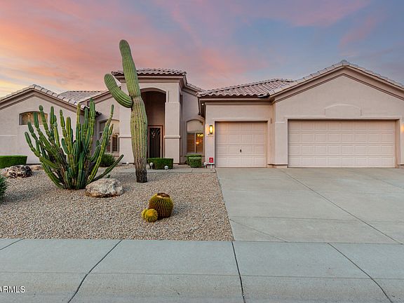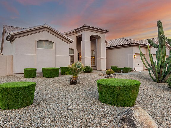 Located in Tatum Ranch community, this beautifully maintained home offers a spacious split 3/2.5 bath floorplan, offers natural light & design. Enjoy formal dining, a welcoming living room, and a kitchen that opens to the family room for both everyday living & entertaining. The kitchen features bar seating, kitchen cabinetry, lighting, a cozy dinette area, crown molding, and plenty of space to gather. A large split primary suite provides privacy & comfort, complete with French doors leading to the outside patio, a walk-in closet, and a luxurious en-suite with a cast iron soaking tub. These secondary bedrooms share a well-appointed second bath. Plantation shutters, blinds, and a dedicated laundry room with a spacious backyard designed for relaxation and entertaining under the Arizona sky.