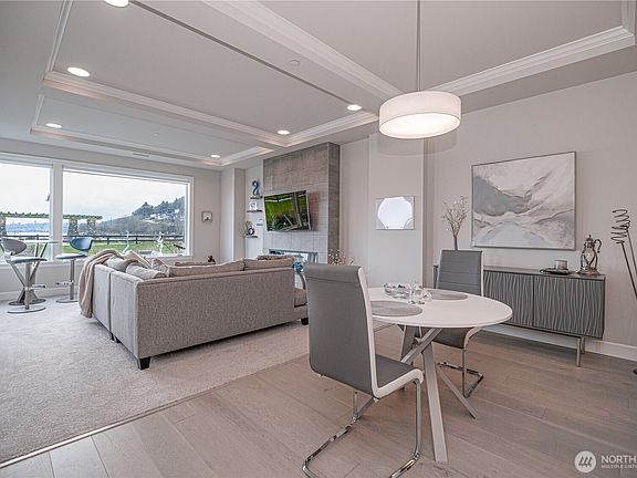 Remarkable 2 bedroom plus den/office with forever views of Tacoma and Mt. Rainier. Main floor condo living with easy access to waterfront trails, shopping, restaurants and just about anything else you'd want in Point Ruston. Better than new with custom closets, window treatments and so much more. Open concept living with kitchen/dining/living rooms looking out with windows and access to the paved patio. Gourmet kitchen with quartz counters and high-end stainless appliances. 2 dedicated secured parking spaces, too. Large owned storage unit acoss from unit. Building features nice amenities including a common room and lobby. Currently has a tax abatement that is active for several more years. Low HOA dues, too.