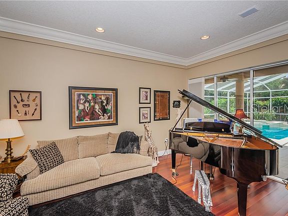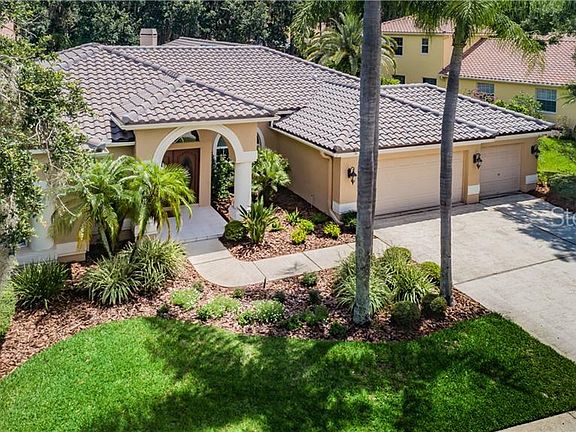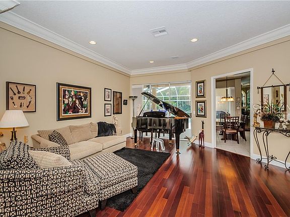Eastlake Woodlands Home, golf course community, full of nature preserves & wildlife, and is located on a quiet street of estate residences. Upon entry through double doors with glass insets, you are welcomed with Brazilian cherry hardwood floors, 10' ceilings with crown molding & baseboards & recessed lighting. Updated kitchen has a unique wood plank look ceiling, pendant lights, a glass cooktop, black granite countertops, under-counter lighting, built-in drawers, oven, microwave & warming drawer, GE appliances & Bosch dishwasher. The family room boasts 14' vaulted ceiling with large crown molding & baseboards, recessed lighting, with adjacent fireplace. Behind the kitchen are 2 of the 4 spacious bedrooms & a large bath. Both bedrooms include large closets with built-in shelving. At the end of the family room is access to the fourth bedroom and the adjacent bathroom. The large master bedroom includes recessed lightning, 10' ceilings, large crown molding & baseboards, a sitting area with sliding door. The bathroom includes large tiled countertops with double sinks, tub, walk-in shower, separate toilet room and large linen closet. Adjacent to the bathroom is a sizable customized master closet. The outdoor living space includes a spacious covered area & tiled pool deck. The large screen enclosure covers the uniquely shaped pool & spa. The entire pool & patio area is private with no visibility to the neighbors, only wildlife. Reclaimed water sprinkler system, newer a/c & brand NEW tile roof.