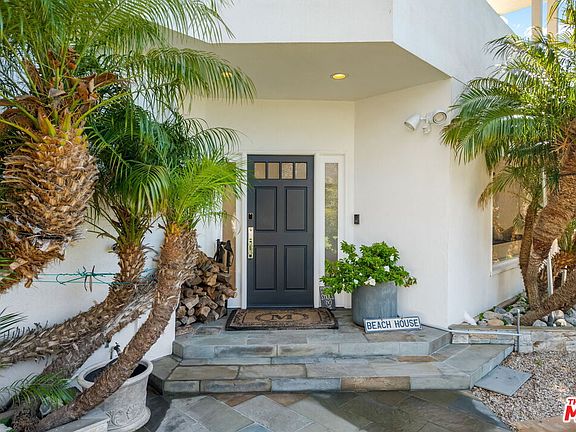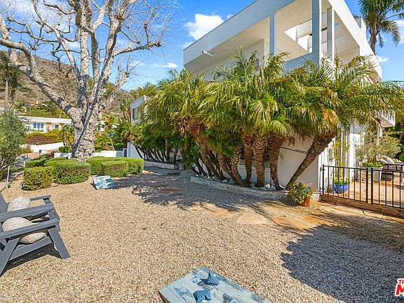 Open and comfortable, this Broad Beach contemporary occupies a gorgeously landscaped cul-de-sac corner lot with ocean views and across-the-street access to Sea Level Beach. With private patios and wraparound ocean-view decks, the home is both a private refuge and a lovely setting for indoor-outdoor entertaining. The living room is both spacious and open, with a fireplace, an enormous picture window onto a palm-fringed garden, and sliding glass doors to an outdoor living and dining patio. A wide doorway opens into the kitchen/dining room, complete with island, bar seating, top-grade appliances, and another glass door to the backyard. Just outside, the ocean-view flagstone patio features a fire pit with ample seating, a table for al fresco dining, and a built-in culinary center with a grill and sink. Also on the home's first level are a butler's pantry and two bedrooms. Sliding glass doors open onto an enclosed side yard with a large Jacuzzi and an outdoor shower. Beyond that, another door leads to a private patio area with additional room for relaxing and dining, plus a second outdoor shower. There are three additional ocean-view bedrooms upstairs, including the tranquil primary suite, which has a wraparound, tiled deck with panoramic views and an infrared sauna, as well as dual closets and a luxurious bath. The home has a two-car garage and guest parking, plus another beach-like outdoor recreation area to the side of the main entry. This lovely property combines the quiet comfort of Western Malibu and all the attractions of the beach lifestyle.