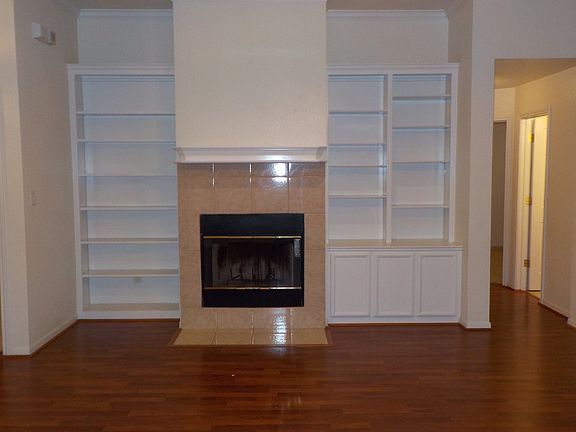 Cozy fireplaceLaminate flooringLarge windowsKitchen boasts appliancesDouble vanityCustom cabinetsSeparate shower