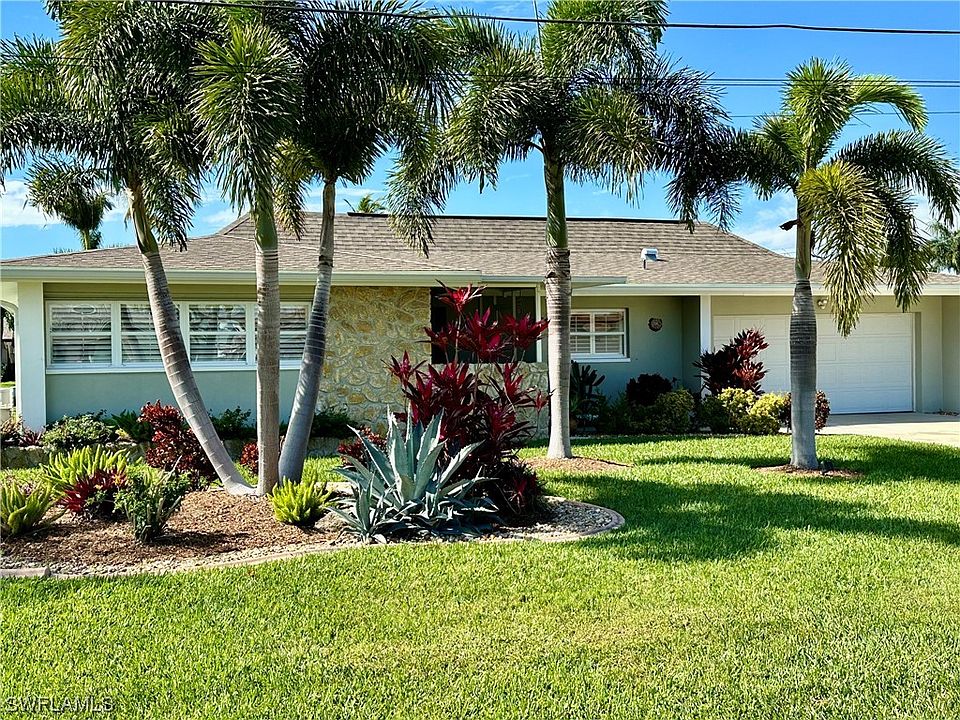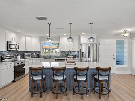 Exceptional and exquisite choices were made in the redesign of this Florida style home located in the boaters dream community of SW Cape Coral. Welcomed with lush landscaping, fastidious care and maintenance of the property is evident. The interior was smartly opened up incorporating the living and Florida room into a great room design with the kitchen central to the entertainment area. No detail was spared in the design of the kitchen, from the finely crafted shaker style cabinets, to the extensive use of quartz and upgraded stainless steel appliances. Insulated windows and doors bring light and life to the home and provide a brilliant access to the expansive pool and patio area. The pool with integrated spillover spa and aggregate pool finish is the center piece of the extended lanai, beckoning you to lounge in the sunshine at your own personal oasis. The improvements continue with plantation shutter window dressings and lavish upgrades to both the main bathroom and guest bathroom. Move in ready with new floors, appliances, and roof in 2023. A boater's delight with composite dock, 16,000 lb lift and fast direct Gulf access. No bridges and located near Cape Harbour & Tarpon Pointe