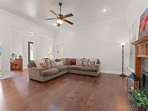 Welcome to this well maintained 3 bedroom, 2 bath home in the Woodstock Subdivision. From the moment you arrive, you’ll appreciate the inviting curb appeal with mature landscaping, colorful crepe myrtles, and a wide driveway leading to the double garage. Inside, an open floor plan seamlessly connects the living, dining, and kitchen areas, perfect for everyday living. The spacious living room is anchored by a cozy fireplace with a detailed wood surround and large windows that bring in natural light and offer views of the backyard. The kitchen features warm Beechwood cabinetry, granite countertops, a large island, stainless steel appliances, a gas range, and a walk-in corner pantry, making meal prep and storage a breeze. The adjoining breakfast area is filled with light and opens directly to the covered back patio for easy indoor-outdoor flow. Retreat to the large primary bedroom with tray ceilings, wood floors, and backyard views. The ensuite bath offers double vanities, granite counters, a soaking tub, separate shower, a walk-in closet, and plenty of built-in storage. There are two additional bedrooms that are well-sized with good closet space and share a full bathroom with a double-sink vanity. You’ll also appreciate the large laundry room with built-in cabinetry, a folding counter, and a window for natural light. Step outside and unwind in the spacious, fully fenced backyard, perfect for relaxing or entertaining. The large covered back patio includes ceiling fans and plenty of room for outdoor seating. There’s also a pergola area that’s ideal for additional seating or an outdoor dining setup. Call to schedule your showing today!