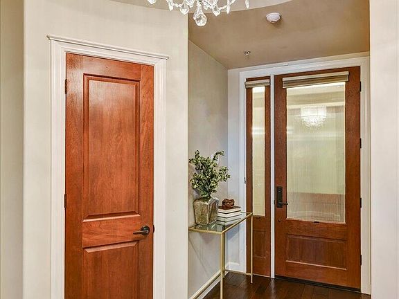 Custom Hunter Douglas window treatments are complemented with elegant designer drapery. 2 dedicated garage spaces, including an electric car charger for eco-friendly convenience.