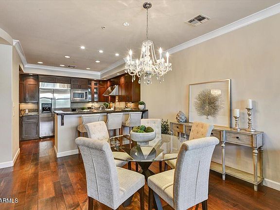 Enjoy Camelback Mtn. views from your private, brick-paved balcony, ideal for relaxing mornings or entertaining guests. Rich hardwood flooring throughout the main living area. Gourmet kitchen with shaker wood cabinetry, SS Dacor appliance, breakfast bar for casual dining.