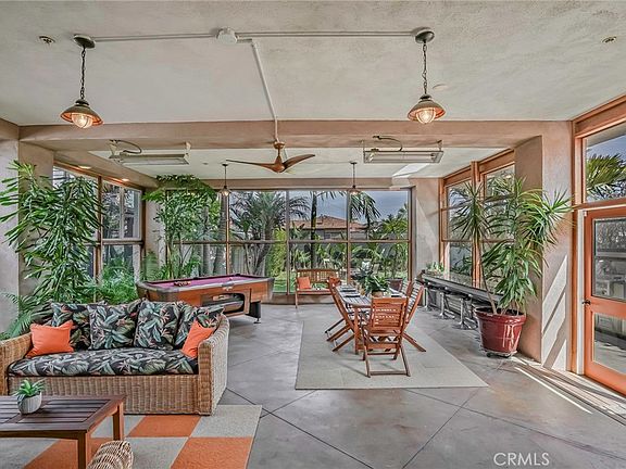 The journey within reveals a glass-enclosed entertainment room, not reflected in the square footage, presenting a spacious haven for various social gatherings. With more than 600 square feet, this area accommodates an inviting TV seating area, billiards, and a spacious dining area. An 11-foot granite bar serves as a bridge to an impressive 16-foot outdoor kitchen — perfect for grand celebrations or intimate alfresco dining. Stepping into the backyard transports you to a tropical oasis where quiet conversation takes place deep into the night surrounded by the warmth of the wood burning fire pit.