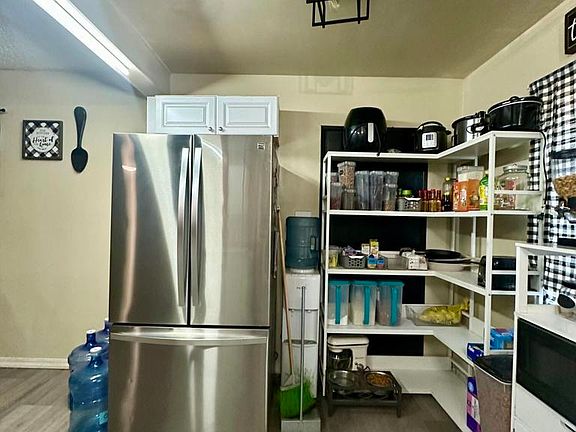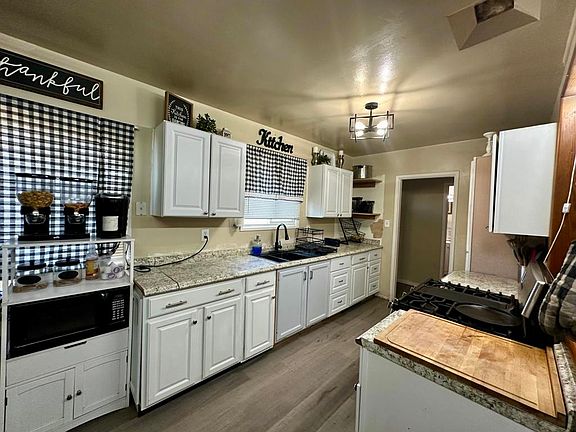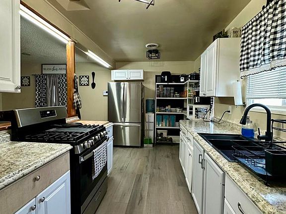 Move-in ready home featuring an open living area, updated flooring, and neutral colors throughout. The kitchen offers white cabinets, updated counters, and stainless-steel appliances.Enjoy three comfortable bedrooms, two updated bathrooms, and a convenient laundry room with extra storage. Energy-efficient solar panels help keep utility costs low.Outside, you'll find a fenced yard, detached two car garage, and plenty of space to relax.