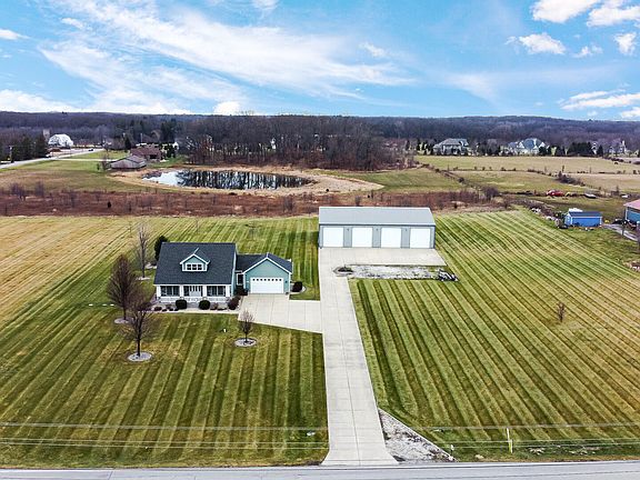 A rare Northwest Indiana opportunity featuring a custom-built home on expansive acreage with an impressive outbuilding. The standout feature is the steel-framed, insulated 60x80 warehouse with a 4-bay garage, built for serious functionality. The warehouse offers high ceilings, four commercial-grade electric garage doors approximately 14.5' tall with RSX overhead openers, a half bath, furnace, hot water heater, water bib, security cameras, disk LED lighting, car lift, 50-amp plug, separate electrical panel, and a 6" reinforced concrete floor--ideal for business use, storage, or advanced hobby needs. Set on 10.01 acres, the property also includes a 3-bedroom, 4-bath custom-built home with 2,897 square feet, built in 2012 and offering Craftsman style with a modern twist. Interior features include an open-concept kitchen and family room, traditional formal dining room, and a finished basement with bar area, perfect for entertaining. Additional highlights include a generator powering both the home and warehouse and a heated attached garage with epoxy flooring.