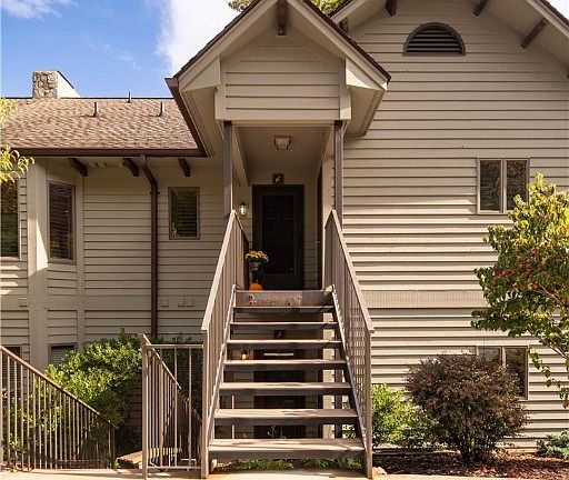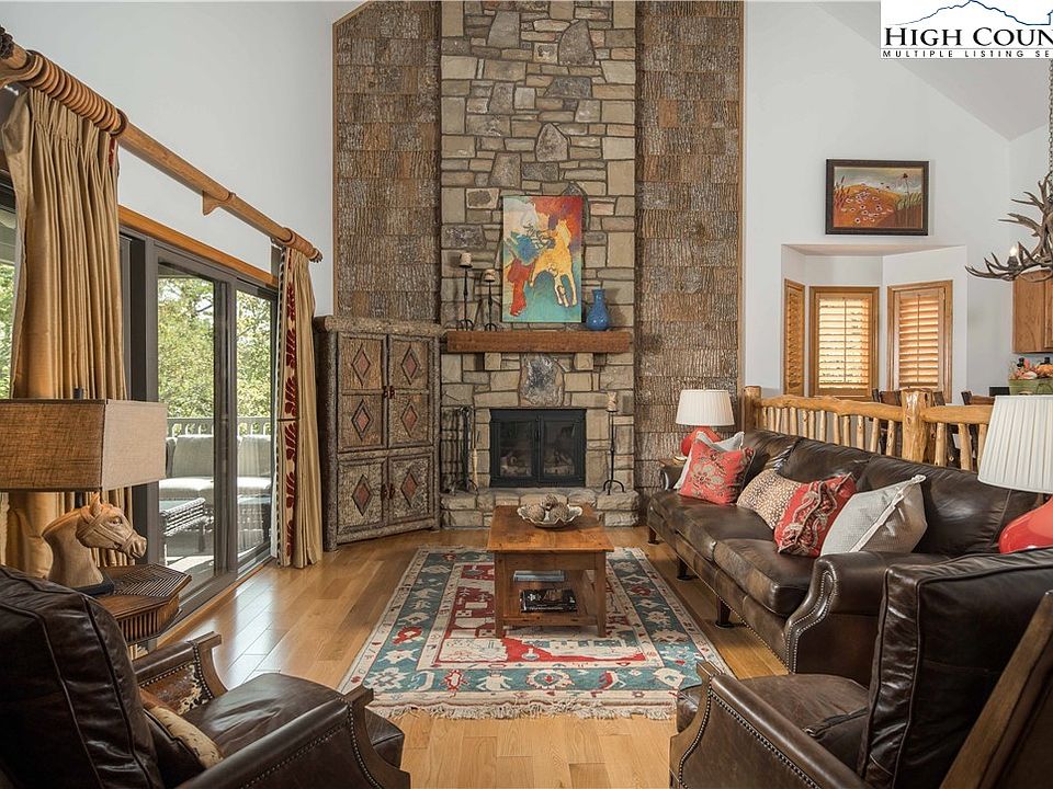 MOVE INTO THIS AMAZING CUSTON DESIGNED CONDO BY THE HOLIDAYS. Perched on the top of Chetola Resort's highest ridge, this stunning condo exudes rustic mountain elegance. This 3-bedroom, 3-bath condo with balcony loft has the touch of a master craftsman throughout. Upon entering the foyer, your spirits are lifted as you view the sweeping high beamed ceiling, the floor-to-ceiling stone fireplace and the handcrafted bannisters on the stairs and balcony above. All through the condo, there is handcrafted wood furniture-some with insets of bark, especially designed for this space. The foyer, dining and kitchen areas, guest bedroom, full bath and laundry areas are on a level two steps above the space below. A quaint banister made of rhododendron and tree limbs divides the two areas of the great room, wet bar, primary bedroom and bath and covered porch. Step down to the sitting area with its large leather sofa, end tables, coffee table and its pair of leather club chairs with pinto fur insets. Beside them is a horsehead porcelain lamp on a unique hexagonal table. Next to the propane fireplace is a tall bark armoire which holds a flat-screen TV. Across through the sliding glass doors, is a covered porch looking out into the treetops. It has a a sofa, end tables, coffee table and two comfortable chairs. A cool area for conversation and cocktails. Back in the great room , there is a well-equipped wet bar flanked by an unusual bark grandfather clock. To the right of the wet bar is the primary suite with adjacent bath with tile shower and whirlpool tub and double sinks. The bedroom is light-filled through a bay window.There is a custom king bed with special bedding and a bark-covered chest of drawers with flat-screen TV on top. There is a generous walk-in closet with shelving.