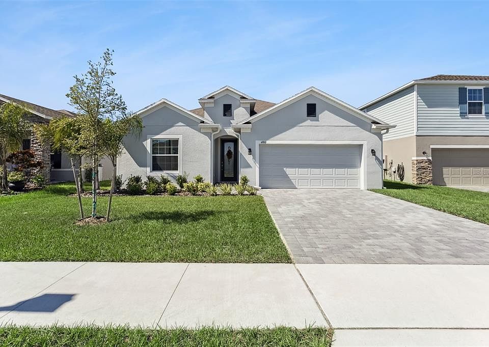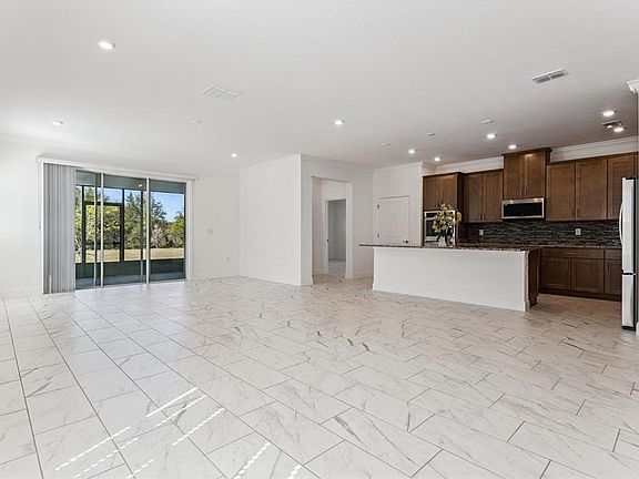 One or more photo(s) has been virtually staged. Welcome to Villa Pass, where this BRAND-NEW 4-bedroom, 3-bath home combines thoughtful design with high-end finishes. Situated on a premium lot with no rear neighbors, this home offers lots of upgrades and style throughout. Inside, you’ll find crown molding and coffered ceilings in the foyer, and tile flooring that extends through the entire home. The spacious great room flows seamlessly into the gourmet kitchen featuring 42” soft-close cabinets, granite countertops, stainless steel appliances, double oven, a glass cooktop, and a designer backsplash. The owner’s suite impresses with a large walk-in closet, double-door entry to the spa-like bath, dual vanities, a walk-in rain shower, and a separate soaking tub. The split floor plan provides two bedrooms with a shared bath and a private ensuite for the fourth bedroom—ideal for guests or multi-generational living. Additional upgrades include quartz counters in all baths, generous storage throughout, a pavered driveway, screened pavered lanai, and a 2-car garage. All appliances and blinds are included. Conveniently located just minutes from Hwy 27, the Turnpike, shopping, and dining—this home truly has it all. *Aerial photo property lines are an estimate and to be verified by buyer.