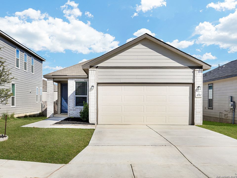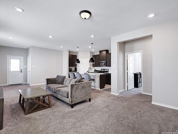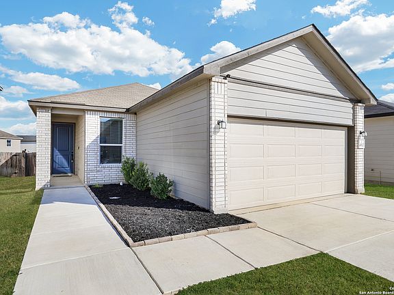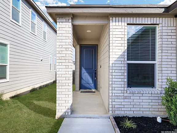 Welcome Home to Modern Comfort and Style!. Built in 2022, this beautifully designed one-story KB Home in the desirable Tierra Buena subdivision blends quality craftsmanship with modern sophistication. Featuring 4 bedrooms, 2 baths, and 1,604 sq. ft., this residence offers thoughtfully planned living spaces perfect for both relaxation and entertaining. Open-concept living area with 9-ft. ceilings that create an airy, spacious feel. Woodmont Dakota 42" upper kitchen cabinets in elegant Black Fox finish, Silestone countertops with extended breakfast bar and Emser Heksa tile backsplash, Stainless steel Whirlpool appliances - 5-cycle dishwasher, glass-top range, and microwave/hood combo, Emser Contessa tile flooring in main areas for durability and style, Cordless blinds, digital thermostat, and coat closet at entryway for added convenience, Master features large walk-in closet, double-sink vanity with knee space, walk-in shower with cascade showerhead and Emser Contessa tile surround, Moen sleek high-arc faucet for a spa-like touch. Fiber optic cable ready for high-speed connectivity, full sprinkler system, rear patio, and two water spigots with electric outlets - perfect for outdoor living, 4 Blink security cameras and Ring doorbell for peace of mind, garage door opener and rough-in for utility sink, soft water loop for convenience. Access to gated community pool. Conveniently located near Hwy 90 and Loop 1604. Backed by KB Home's 10-year structural warranty, this home combines comfort, efficiency, and modern design for lasting confidence and style.