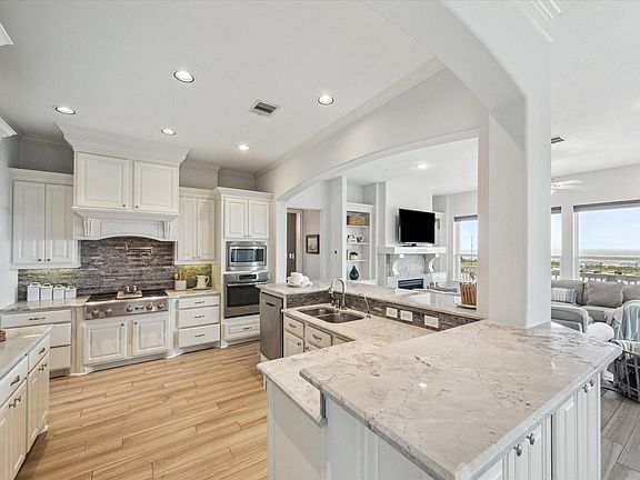 Hidden on a pristine pocket beach, this charming bay house is an idyllic coastal retreat with great fishing steps from your front door and views from every angle. Evening are magically with sunsets and deer sightings. The open-concept main floor is perfect for entertaining, featuring a chef’s kitchen that flows onto the dining and living areas, where a cozy fireplace sets a warm atmosphere. The primary suite features a spa-like bath and ample storage. A dedicated study with a built-in desk provides a quiet workspace. The third level boasts a private bedroom and bath, additional living area with a balcony, kitchenette, and a bunk room – ideal for guests or family. A whole-home generator provides peace of mind. The outdoor living space is designed to capture the breathtaking bay views, and the beach is just a short stroll away. The house is equipped with an elevator and first floor above ground pool room with half bath. This gem is a must see!