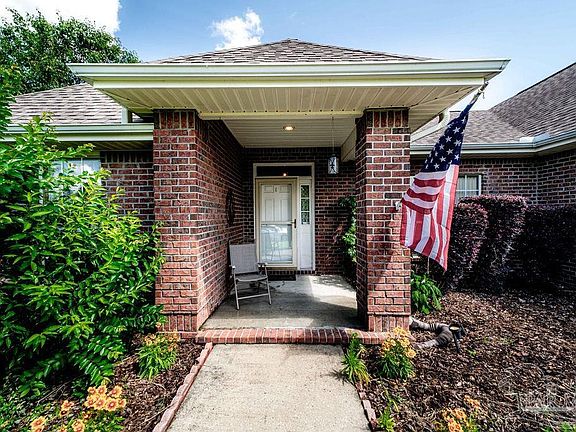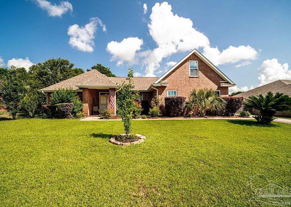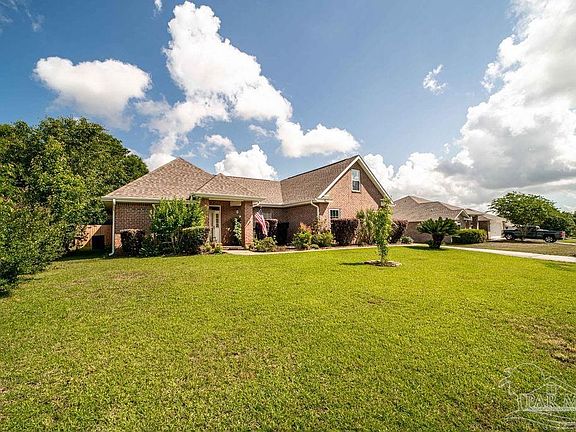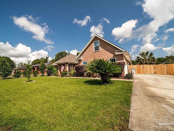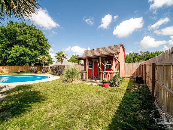 Welcome to this beautiful 4 bedroom 2 bathroom pool home in the popular Brentwood neighborhood in the heart of Pace! A large living room with wood burning fireplace and high ceilings greet you as you enter the home. The kitchen is very spacious featuring oak cabinets and Corian countertops with a breakfast nook and a large formal dining room is just off the kitchen. The 4th bedroom is upstairs over the garage and is quiet and spacious. The 3 remaining bedrooms are a split plan and also feature a bonus office between guest rooms. The large owner's suite includes a very spacious bathroom with double vanities and a HUGE walk in closet. Outside the back french doors, you will find a sparkling pool with a new liner and new pool cleaner, storage building (with electric and new roof!), and beautiful mature landscaping, not to mention a tiki roof pergola for sitting poolside. The roof was recently replaced and features a new water heater, so no worries about insurance! The inside laundry room is just off the kitchen and even has a storage area under the stairs.