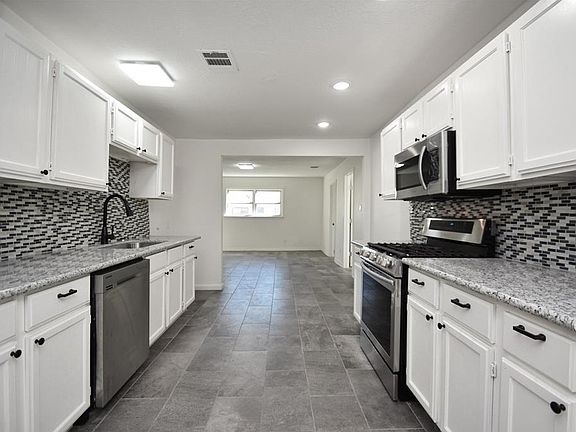 Welcome to 4910 Richfield Ln a beautifully renovated single family home in the South Acres Crestmont Park neighborhood, just 10 miles south of downtown Houston. This 1950 home retains its charm but has been transformed to offer modern comfort. The remodel created four spacious bedrooms and two full baths; the primary suite includes his and hers sinks, abundant storage and a custom tiled shower with black accents. A 30 year roof, new 5 ton AC, upgraded plumbing and a new water heater mean worry free living. Sunlight pours through double pane windows, highlighting hardwood and tile floors throughout the bright, airy 1,719 sq ft interior. The open kitchen gleams with granite counters, a matching backsplash, stainless gas range, microwave and dishwasher plenty of cabinet space makes it ideal for family gatherings. This smoke free home offers a 12 month lease term. LED lighting and ceiling fans in every room enhance efficiency, and the oversized utility room offers a custom folding table. Outside, a newly poured driveway leads to a partially fenced 6,600 sq ft lot. Set on a quiet street, the yard offers space for outdoor activities. Located near the South Freeway and Sam Houston Tollway, the home provides quick commutes to the Texas Medical Center, Hobby Airport and NRG Stadium. The neighborhood offers convenient shopping and dining along Cullen Boulevard. Schools such as Woodson Elementary, Thomas Middle and Sterling High are nearby, and the University of Houston is roughly 6 miles away. With its modern upgrades, generous yard and prime location, this move in ready home is perfect for renters seeking style and convenience.