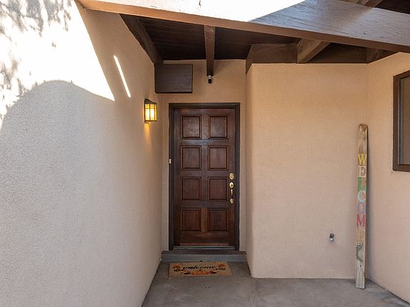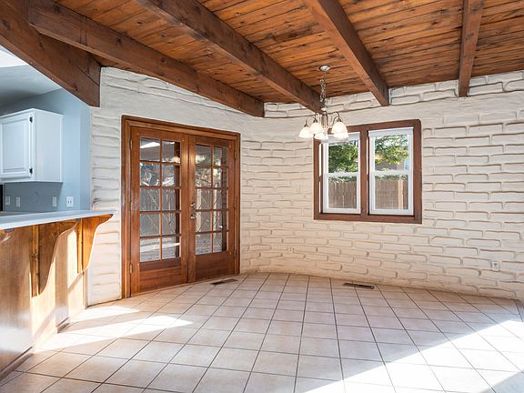 Step through the welcoming courtyard into this southwestern home featuring adobe brick walls, ceilings with exposed wood beams, and brick flooring! Custom windows throughout the home flood each room with natural light while the fireplaces offer warmth for cozy nights, and refrigerated air for those hot summer days. Two spacious bedrooms, a roomy primary, and an oversized living room offer plenty of space to spread out. A cute patio off the dining area awaits you, as well as a backyard ready for all your gardening ideas. Located close to schools, shopping, and much more, come discover your new home!