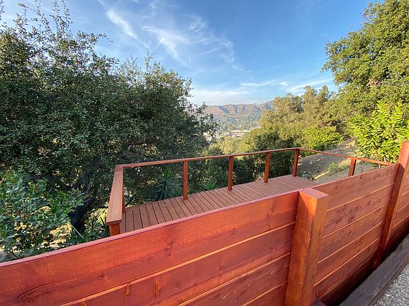 Sleek, modern, and serene are just a few words that begin to describe this modern remodeled view home perched on top of the highest hill in Eagle Rock! At first glance, the contemporary facade design of the home makes a bold statement, teasing for what is to come inside. Open layout offers vaulted ceilings, high end fixtures, finishes, and amenities to be on full display with no square inch left behind. Engineered European Oak flooring carries you through the spacious living and into the kitchen that makes a statement with self-enclosed cabinetry, quartz countertops, and large breakfast bar in combination with high-end chef appliances. With an abundance of windows in the living, kitchen, and all 3 bedrooms, everywhere you turn there is amazing views to be seen overlooking Downtown Glendale, Griffith Observatory, Century City, and the omnipresent city night lights. The master has a spa-like bathroom with dual vanities, soaking tub, and walk-in shower. A sliding glass door in the master extends jaw-dropping views of the city and valley. The balcony itself covers the entire home offering a spacious balcony set up. On the second floor you have 2 large bedrooms each with their own full spa-like baths. The second floor also offers a glass sliding door to a spacious balcony offering the same impressive views. To top it all off, a private expansive wooden deck with views is perfect for entertainment, lounging, or simply relaxing to watch the stars at night or sunset in the evenings.