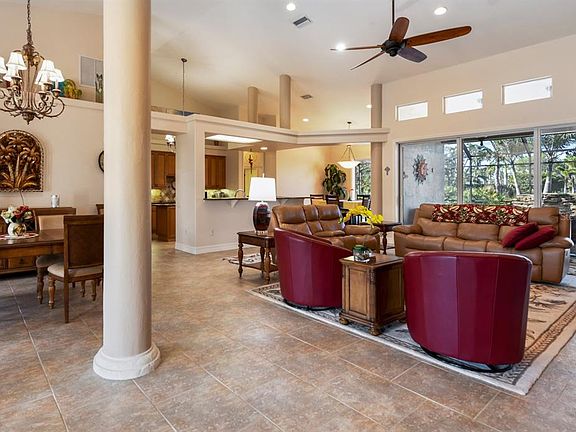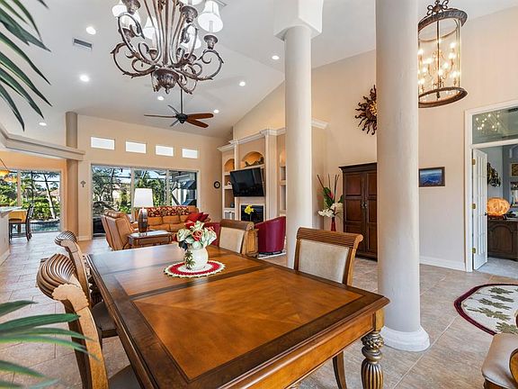 Enjoy the best of both worlds — a custom estate home without the yard work! Nestled among other stunning custom residences, this spacious home in the sought-after Linkside community offers effortless living, a desirable open floor plan, and numerous updates. From the curb, you’ll be impressed by the new roof, refreshed exterior paint, and lush tropical landscaping. Inside, soaring ceilings and a bright, inviting great room create an open, airy feel — and the beautiful furnishings are included! The central living area features a cozy fireplace and opens to a chef’s kitchen with an extensive breakfast bar, granite counters, tumbled tile backsplash, 42” hardwood cabinetry, and stainless-steel appliances, including a brand-new wall oven and microwave combo. A large dining area easily accommodates ten guests, while the adjacent office/den with built-in shelving offers a perfect space to work from home or extra space for visiting guests. The split floor plan ensures privacy for all with a guest wing including two generously sized bedrooms with king beds, large closets, and updated carpet, plus a shared bath with dual vanities, a walk-in shower, and direct pool access. On the opposite side, the owner’s suite is a true retreat with a relaxing sitting area, French doors to the pool area, two walk-in closets, and a luxurious bath featuring a dual-sink vanity, soaking tub, and walk-in shower. Step outside to your private outdoor oasis — where a covered lanai with a summer kitchen featuring new grill, sink, and storage overlooks a sparkling pool with a captivating stone waterfall and western exposure for breathtaking sunsets. The lush landscaping behind the pool provides additional privacy and allure. The oversized 2½ car garage with epoxy flooring offers space for two vehicles plus a golf cart, with organized closet storage along the back wall. Additional upgrades include an 80-gallon water heater, storm shutters, and a generator-ready breaker panel for peace of mind. Enjoy resort-style amenities in this waterfront gated community with a fitness center, tennis and pickleball complex, 27-hole executive golf course, activity club, yacht club, Freedom Boat Club, and two onsite restaurants – all accessible by golf cart. With the fastest access to open water in Southwest Florida, you can boat all day and play all night. This beautifully maintained, fully furnished home is move-in ready — what are you waiting for?