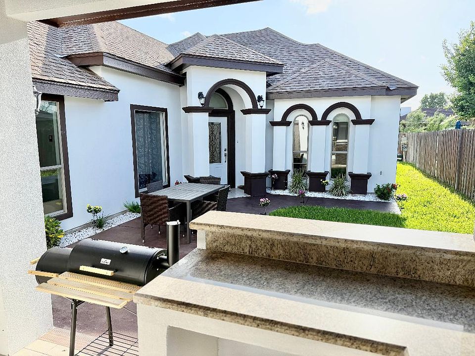 NEWLY REMODELED. EXTREMELY comfortabl, professionally landscaped, fully furnished property , Ch/a, most of fence is new. Both courtyard entrance and courtyard bars, eating area with table, chairs, granite counter top with sink for outdoor cooking in the peaceful courtyard. Swing in couryard. Garage door opener, large drive. Huse is private, on culdesac, lots or room to park. SHARYLAND SCHOOLD DISTRICT but McAllen water, garbage. FULLY FURNISHED, PROFESSIONALLY DECORATED, drape, as well as faux wood blinds in every window. Disposal, custom cabinets, gramite counter tops, Stone deco wall in living room behind Tv( 4 tvs provided). Garage has a restroom and expensive expoxy flooring. Very comfy, pleasant home. WILL RENT SHORT TERM OR LONG TERM. Currently used an Air bnb but I desire a more predictable income. Back yard large enough for rectangular above grond pool, which I would consider. Perfect for out of town workers, traveling nurses, or families making an extended visit. Will rent weekly, montly, or even yearly. Prefer to rent furnished as it was expensive to stage. Outdoor lighted at night(I dON'T haVe pictures yet) Home has so much to offer, wal in closets 2 showers. solid gel meory foam new mattresses. Master has king, 2nd bedroom queen, both have gray farmwood wood frames with usb and regular plugs, lighting. 3rd bedroom has 14 trundle bed with 14 inch gel foam double mattress on top, twin pull out.