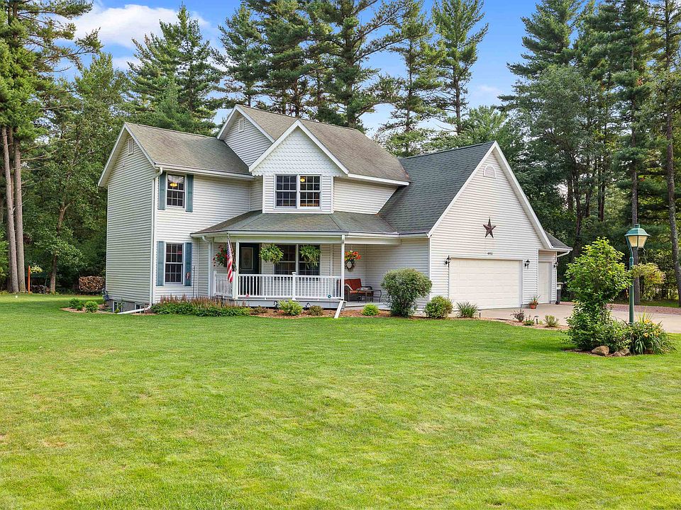 Full of character, this beautiful home sits on a spacious wooded lot, minutes away from Lake Wazeecha and Lake Nepco. Enjoy a welcoming front porch and a private back yard-- perfect for barbecues and relaxing nights around the fire. Inside you'll find a cozy wood-buring fireplace, formal dining space, and an eat-in kitchen. Upstairs features a large primary suite with an en suite bath and walk-in closet, plus three more bedrooms and a second full bath. The partially finished lower level is all set for movie nights in the media room, plus a bonus area that can serve as an office, play room, or hobby area. Three-stall attached garage, updated sprinkler system and camper pad complete the package. Schedule your showing today!