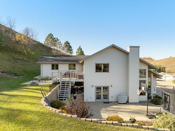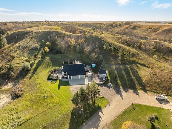 Situated just outside of Minot, this custom home tucked into scenic rolling countryside hills on a quiet dead-end road. The moment you step inside, large windows bathe the interior in natural light, creating a bright and welcoming atmosphere. The living room features soaring vaulted ceilings and opens to the kitchen and dining area, with doors that lead to the patio for seamless indoor-outdoor living. A bathroom is conveniently located off the kitchen, and a spacious laundry area sits nearby in a dedicated space. The main floor also includes a large bedroom, a family room, and a storage area. Upstairs reveals an inviting loft with access to the deck, four bedrooms (including a primary suite with a walk-in closet and a shower), a full bathroom, and an office. Garages include a heated 3-car attached garage with floor drains and a separate single detached garage offering extra storage or workshop space. The basement floor and the attached garage also feature heated floors for added comfort. The home is built to endure with 8-inch installed concrete forms, delivering superior energy efficiency for heating and cooling. This well-maintained, thoughtfully constructed residence offers ample living space and endless potential, making it a standout property. Schedule a showing today with your favorite Realtor.