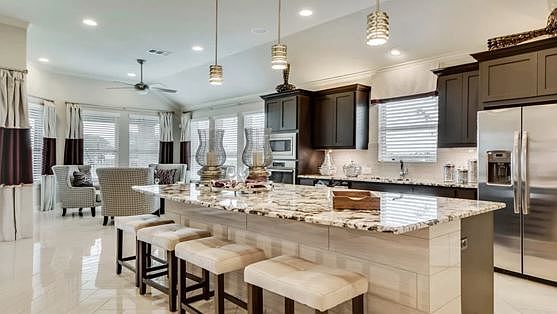 Model Home Available! Bellvue B by Taylor Morrison ~ Ready September! With its open layout and outdoor living options, the Bellvue floor plan is the perfect home for entertaining friends and spending quality time with family. At its center, a generous space made up of the kitchen, family room and dining room creates an airy feel. It's easy to envision a get-together among friends here. A large center island with breakfast bar is ideal for setting out appetizers. The handy walk-in pantry makes getting to non-perishables and supplies easy. While you prep snacks your friends can gather on the extended covered patio with rear wrought iron fence. Set off for privacy, your owner's suite promises a quiet haven away from the hustle and bustle of daily life. Your owner's bath is roomy and luxurious. His and her vanities and the oversized glass-encased shower features a convenient seat. A third bedroom with private bath and walk-in closet makes a great space for guests. A sun room is perfect for relaxing! This model home shines with cedar beams in foyer, stone to ceiling fireplace with hearth, upgraded interior doors/lighting package/cabinetry, fixtures, faucets and sinks. Upgraded appliances including refrigerator, wine refrigerator and warming drawer. Upgraded flooring makes this home a beauty. Structural options added to 4912 Fiore Trail include: Cantera Entry Door, Fireplace, Study, Built in kitchen, Sun Room and Extended covered patio.