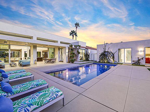 Experience modern desert luxury at its finest in this exceptional 4-bedroom, 6-bathroom estate, perfectly positioned adjacent to the tee on the 14th fairway of Ironwood Country Club's prestigious North Course. Originally built in 1984 and completely reimagined in 2018, this residence combines timeless architecture with contemporary design is offered TURNKEY FURNISHED, showcasing impeccable craftsmanship, high-end finishes, and the functionality of a newly built home. Step through the gated front courtyard into an expansive great room featuring soaring ceilings, recessed lighting, a dramatic fireplace, and 24-inch slate tile flooring that flows seamlessly throughout. Floor-to-ceiling pocket sliding doors blur the lines between indoor and outdoor living, while upgraded windows and custom window treatments frame breathtaking golf course views from nearly every room. The gourmet kitchen is a chef's masterpiece, boasting quartz countertops, custom cabinetry, premium stainless steel appliances, a wine chiller, and a temperature-controlled wine closet. Brand NEW whole house water filtration system! The luxurious primary suite serves as a private sanctuary, offering dual bathrooms, a dedicated office space, and direct patio access. Two additional ensuite guest bedrooms open onto private outdoor sitting areas, while a detached casita--complete with a living area, wet bar, bedroom, and full bath--provides the perfect retreat for guests. Designed for entertaining, the home's 29' x 30' second-story observation deck captures sweeping panoramic views of the fairway and surrounding mountains. The resort-style courtyard is a true desert oasis featuring a sparkling Pebble Tec pool, spa, fire pit, built-in grill, and covered dining area surrounded by lush, low-maintenance desert landscaping. Sustainable luxury comes with a fully owned 42-panel solar system for maximum energy efficiency. Enjoy your own fruit harvest with mature avocado, peach, guava, grapefruit, lemon, and fig trees. Every detail of this extraordinary home has been meticulously curated to deliver elegance, comfort, and sophistication--an unparalleled lifestyle in one of Palm Desert's most desirable communities. Experience the ultimate in golf course living--schedule your private tour today!