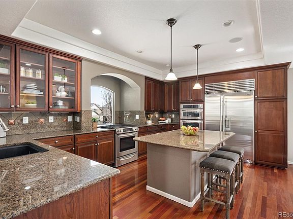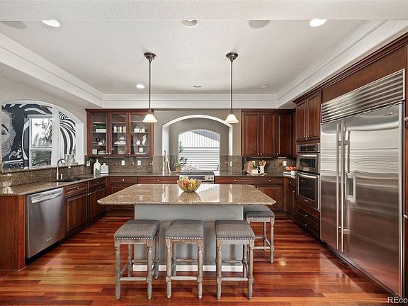 Here’s your chance to own something truly special in Green Valley Ranch—a former model home with standout curb appeal, a 3-car garage, and custom touches you won’t find anywhere else in the neighborhood. With just a handful of this floorplan ever built, this is a rare chance to own nearly 4,000 square feet with large, open rooms and a flexible, functional layout. Inside, the upgrades are everywhere. From the custom paver driveway to the built-ins throughout, this home has been thoughtfully designed with both beauty and everyday function in mind. The kitchen is a showpiece—huge and highly upgraded with professional-grade Sub-Zero fridge, gas range, double ovens, upgraded cabinetry, and a spacious eat-in area that’s perfect for gatherings. A hand-painted mural by a local artist adds personality and warmth to the dining room—it’s a conversation starter in the best way. The home also features a brand new concrete tile roof and partial new windows, adding lasting value and peace of mind. Upstairs, you’ll find four bedrooms all on one level—including a spacious primary suite with double door entry, tray ceiling, 5-piece bath, and oversized walk-in closet. The walkout lower level adds even more flexibility with a wet bar, theater setup (wired for projector with screen in place), and a charming under-stair play nook. Step outside to a low-maintenance yard with a gas line for a grill or firepit, a built-in water feature, and even a small bridge that gives the space unexpected charm. This home blends thoughtful upgrades, generous space, and a model-home level of detail that still shines through. From the moment you arrive, it simply feels special. Ideally located just two blocks from the Green Valley Ranch Rec Center and library—and close to the Beer Garden, schools, and numerous parks—you’ll love the convenience and energy of life in the GVR community. An added bonus is easy access to LightRail for downtown and airport commutes as well as close proximity to highways