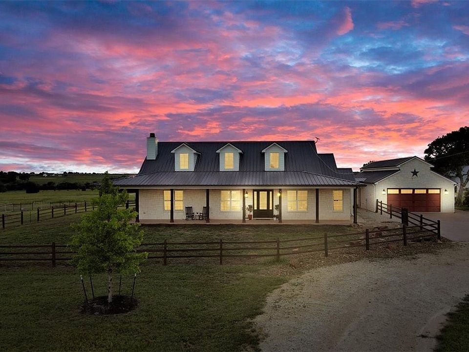 This is what living in Texas is all about y’all! Perched on a hill with breathtaking views of rolling hills and big skies, this property has everything central Texas has to offer! We all know how important location is and this property has the perfect balance of convenience and the solitude of the country. This is a classic Texas Hill Country style home with a modern flair and features a stunning wrap around porch. The large, open floor plan is perfect for entertaining. A second spacious master suite makes this home truly flexible. The guest house is very private and features one bedroom with a walk-in closet, a full bath, washer & dryer hookups, a full kitchen and has it’s own amazing views out of every widow. The home is equipped with a full home Generac generator and a storm shelter. The property is fully fenced and also has cross fencing separating the pastures making it perfect for horses or livestock. There is also a 40X50 Shop with a roll up door for RV parking and a 40X40 pole barn for livestock, an established garden with greenhouse, a large chicken run with a beautiful coop, a stock tank and fertile pastures that make this the perfect sized ranchette to live a homesteader’s dream!