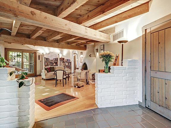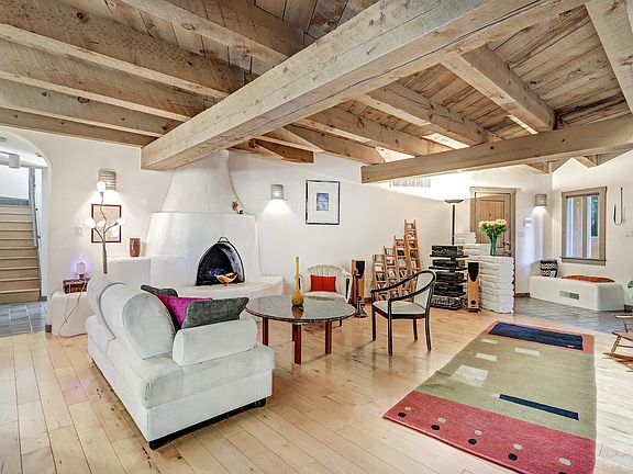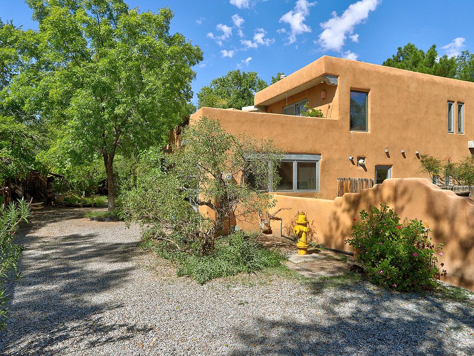 Tucked at the end of a private lane, this North Valley home on a secluded 0.30-acre lot offers light-filled spaces, charm, and timeless character. The open main level features a warm living area with wood-beamed ceilings and a kiva fireplace, a lovely dining space, and a cozy kitchen making this space ideal for entertaining. The lower level includes a guest bedroom with ensuite bath, a spacious office, and a sunroom. The primary bedroom is upstairs, wonderfully separated from the other spaces, and boasts a private balcony. The versatile roof top studio/private bedroom, accessible by rooftop walkway or interior ladder, provides for the perfect serene escape. Outdoors, the peaceful backyard, framed by mature trees and bordering the irrigation ditch, invites year-round enjoyment.