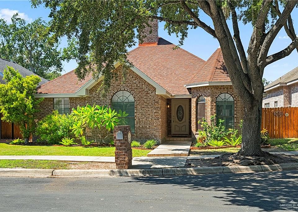 Charming Brick Home in NE McAllen, Tree-Lined Street. Nestled on a beautiful tree lined street in Northeast McAllen, this inviting 3 bedroom, 2 bath brick home blends classic curb appeal with practical comfort. A mature shade tree and arched windows welcome you inside to a bright living area with a tray ceiling, a painted brick fireplace, and sliding doors that open to a spacious patio and private, fenced yard. The white kitchen features granite counters, abundant cabinetry, a gas range, and a cheerful breakfast nook with plantation shutters. Tile flooring runs through the main areas for easy care. The flexible front room with built in shelving works perfectly as a study, library, or guest space. You will love the oversized laundry room with sink and storage. Enjoy outdoor dining on the patio and the convenience of nearby shops, schools, and dining. Warm, move in ready, and well located in desirable area.