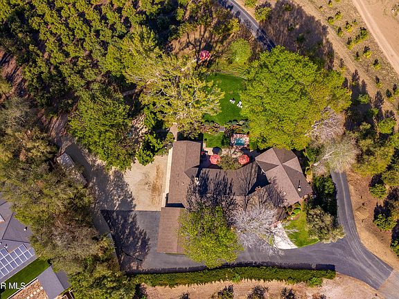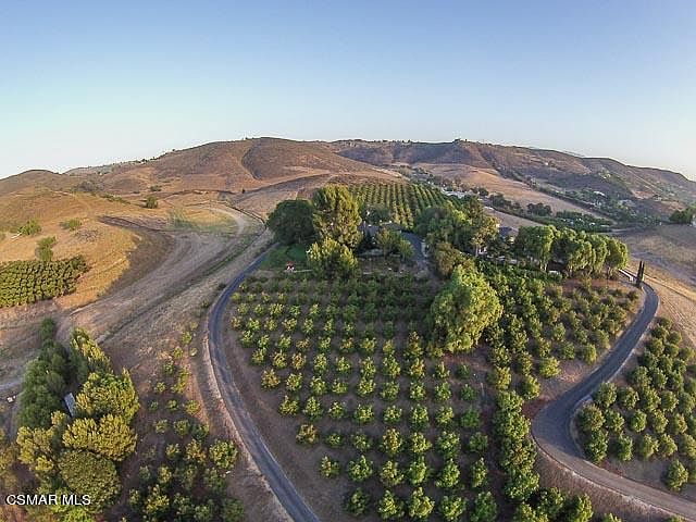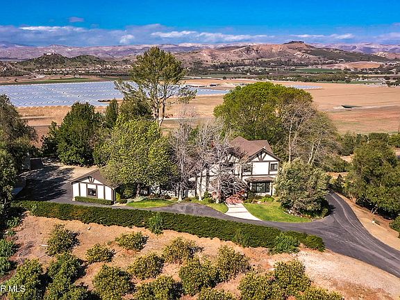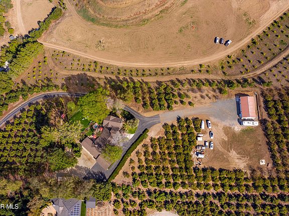 Custom hilltop estate, was once part of the Joel McCrea Ranch, sitting on 5 acres and featuring a working avocado ranch, a barn with electricity & water, fruit trees, expansive parking including RV access, a sport court, amazing views of the Tierra Rejada Valley and hilltops, privacy and seclusion, and a custom home featuring loads of storage capacity throughout the home, a stately brick porch with a double door entry, travertine and sculpted carpet flooring, dual paned windows, a step down formal living room with a bay window and window seat and a chandelier, a formal dining room with a chandelier and a view window, a spacious upstairs master suite with a view balcony and a plank and beamed cathedral ceiling, an inviting wet bar adjacent to the expansive family room also featuring a brick fireplace and raised hearth, a vaulted plank and beamed ceiling and a slider to the back patio and sprawling manicured lawn displaying breathtaking views, a waterfall, stately trees, a tiered patio with a spa and brick accents, and to the side is a fenced sand playground. At the heart of the home sit the well-appointed island kitchen and breakfast nook featuring state-of-the-art appliances, a trey ceiling, a breakfast bar, a plank and beam vaulted ceiling in the breakfast nook with a floor to ceiling brick fireplace and a glass paned door and side panels to the patio. The 4 secondary bedrooms are generous; one is en suite with a bathroom. There is also a lovely powder room, and an extra-large laundry room with a utility sink, cabinets galore, a built-in ironing board, a folding counter and a slider to the side. The over-sized 2-car garage displaying awesome built-in storage cabinetry, work benches, a storage closet and so much more! This property is also equestrian zoned and is located in the beautiful Tierra Rejada Valley offering seclusion and privacy, yet is very convenient to the 23 and 118 freeways.