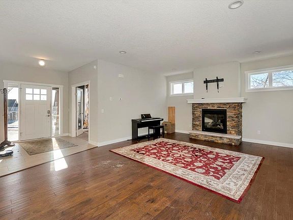 - Description: Forced air, engineered hardwood floor, 5 fixed double pane windows, recessed lights, sheetrock ceiling, gas fireplace, stone hearth, wood mantle
